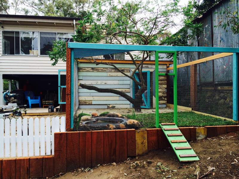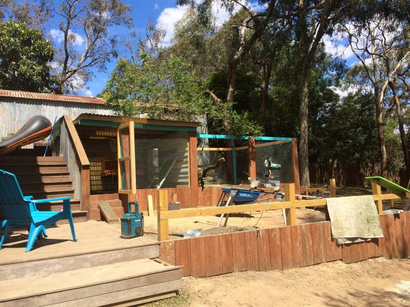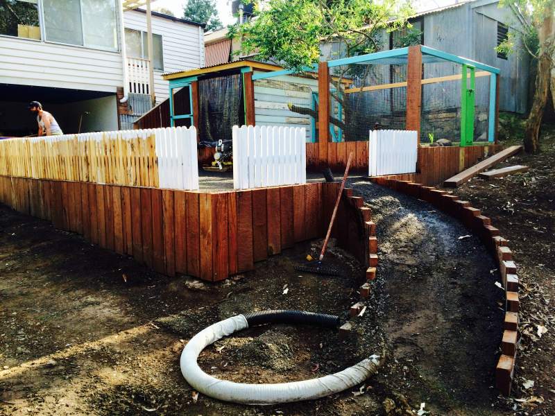 Involved the excavation of existing backyard. Elevated chicken coop built included a sheltered, semi enclosed room with roosts, lay boxes etc and a fenced outer area with natural lawn, pond and river rocks.